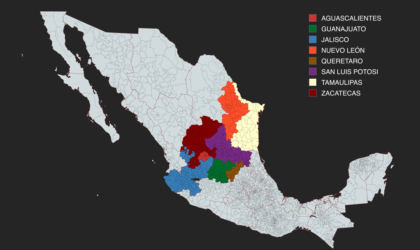 San Luis Potosí, Guanajuato, Nuevo León, Zacatecas, Queretaro, Tamaulipas, Aguascalientes, Jalisco